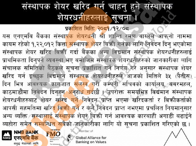 The existing promoter of NMB Bank Limited is selling 1,22,012 shares to its promoter shareholders.